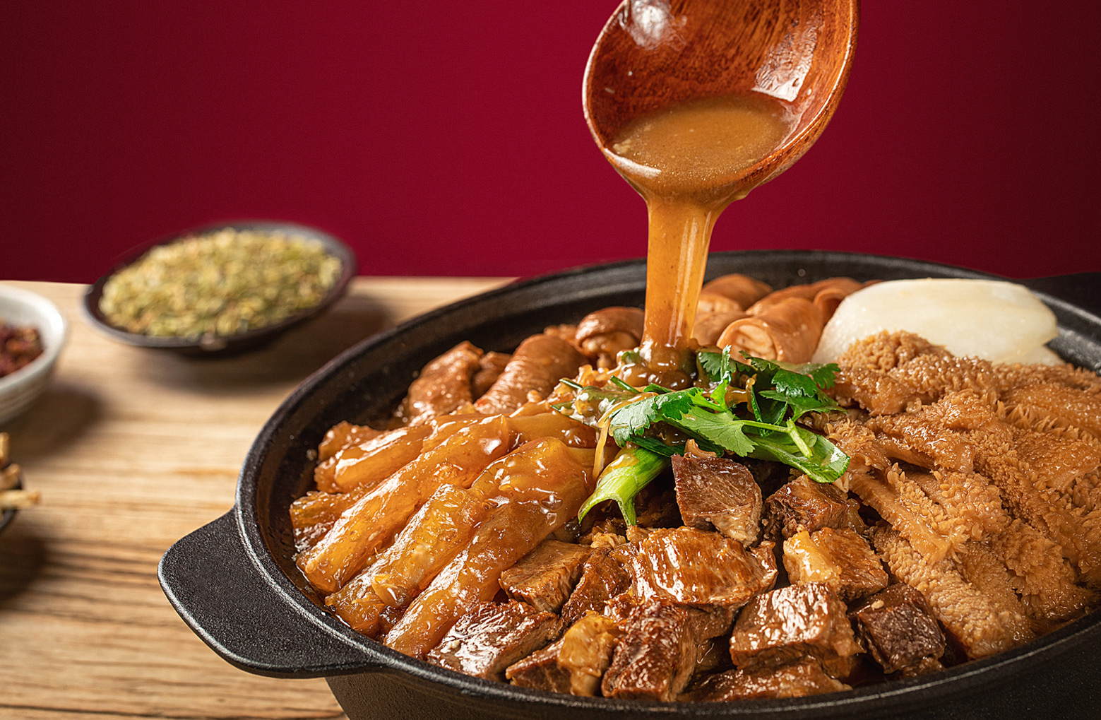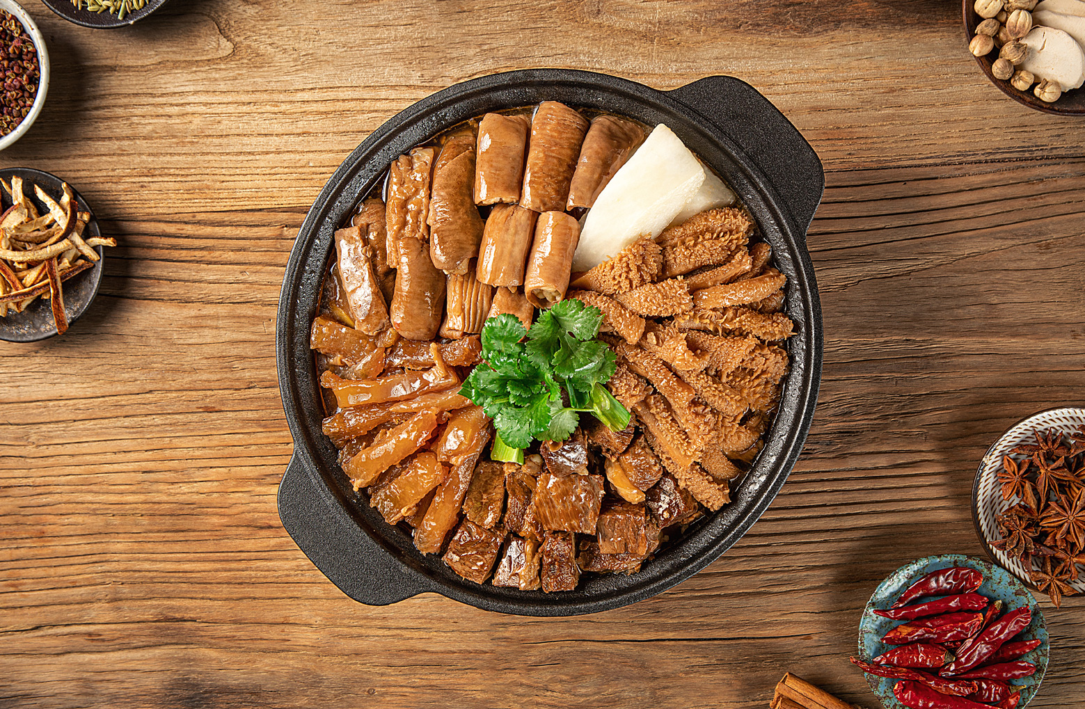 為將一道牛腩牛雜煲做到極致,廚曰精選優(yōu)質上等牛雜,從100公斤牛雜中,只清理出10公斤上等牛雜原料,經(jīng)過甄選、凈洗、預配、 汆焯、煸香、炒制、熬湯、調味、燜煮、文煲等多道工藝,加入精心秘制的醬汁,及十多味中草藥材配備牛骨熬出的高湯底料,既美味又養(yǎng)生。文火慢燉的烹調方式,使食材充分入味,讓整個煲吃起來,不油不膩,口感層次豐富,給味蕾以極致的享受。